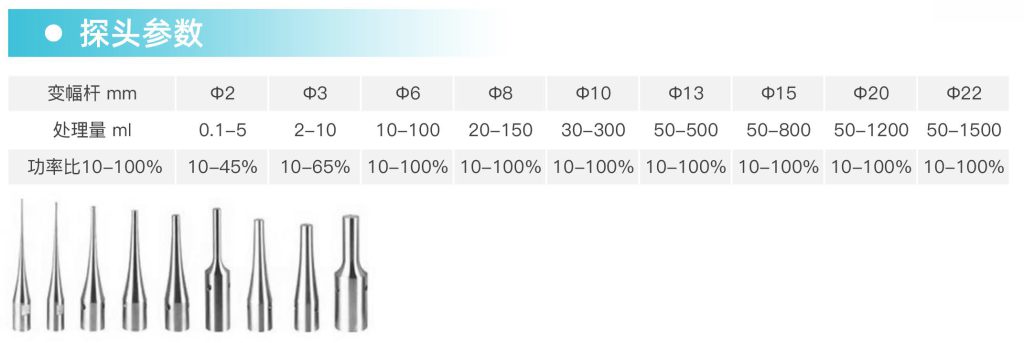 超聲探頭采用美標TC4材質的高純鈦合金,探頭形狀:錐形、鞭節(jié)形,發(fā)波形式:垂直超聲。